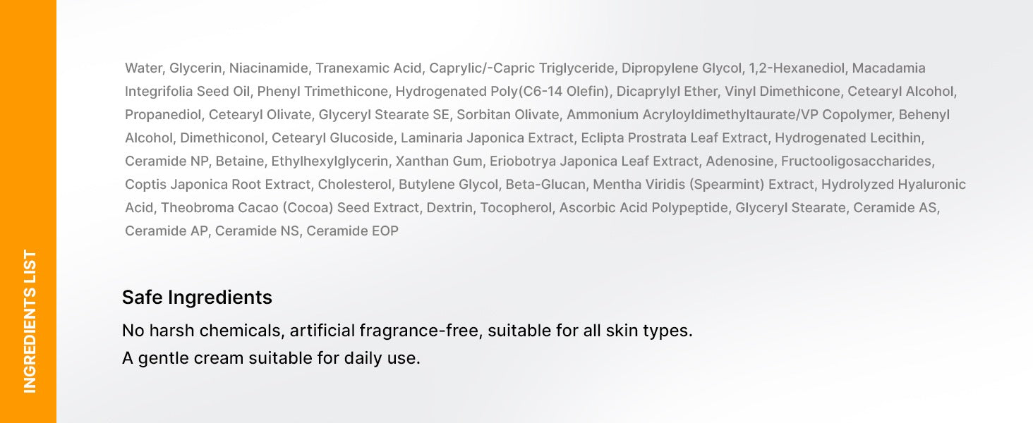 Water, Glycerin, Niacinamide, Tranexamic Acid, Caprylic/Capric Triglyceride, Dipropylene Glycol, 1,2-Hexanediol, Macadamia Integrifolia Seed Oil, Phenyl Trimethicone, Hydrogenated Poly(C6-14 Olefin), Dicaprylyl Ether, Vinyl Dimethicone, Cetearyl Alcohol, Propanediol, Cetearyl Olivate, Glyceryl Stearate SE, Sorbitan Olivate, Ammonium Acryloyldimethyltaurate/VP