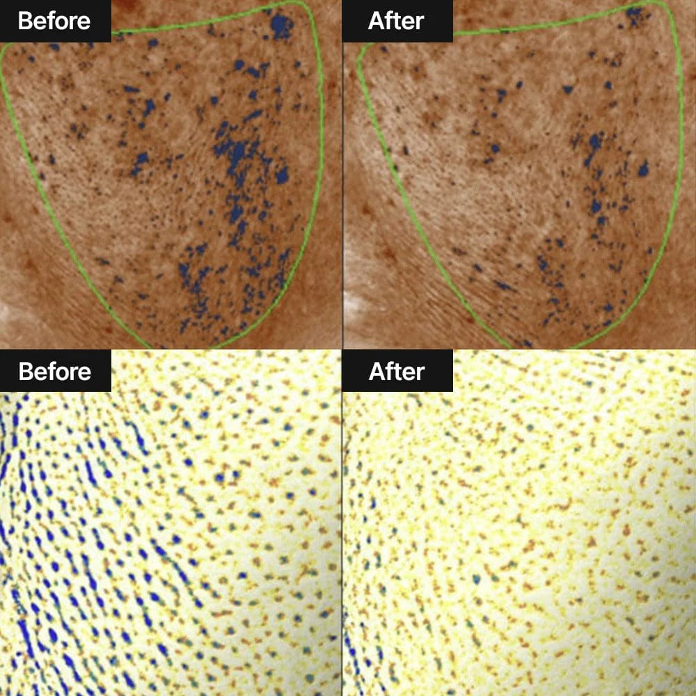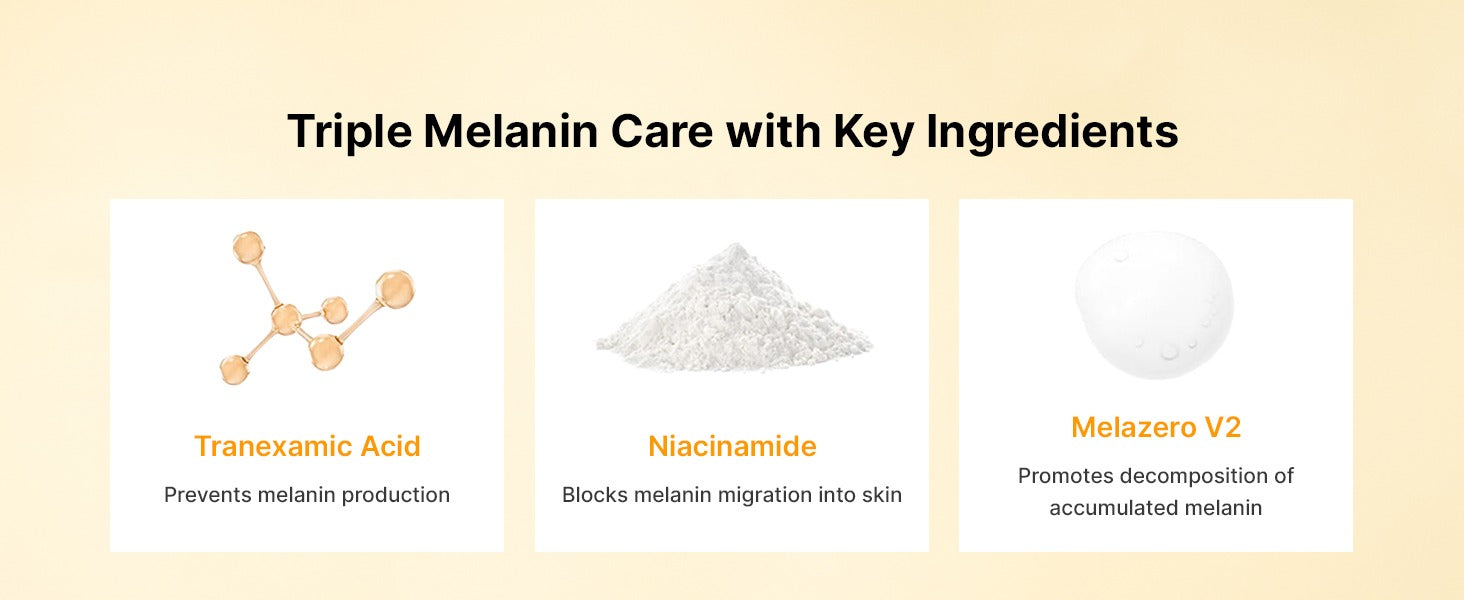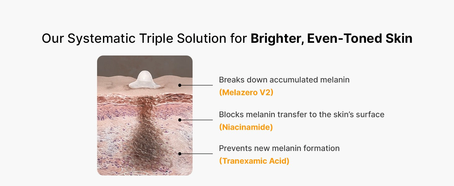 Triple Blemish Care: Achieve a porcelain-like complexion with our serum that targets pores, dark spots, and uneven skin tone. Formulated with 5% Niacinamide, 5% Tranexamic Acid, and 1% Melazero V2, it provides comprehensive melanin care.