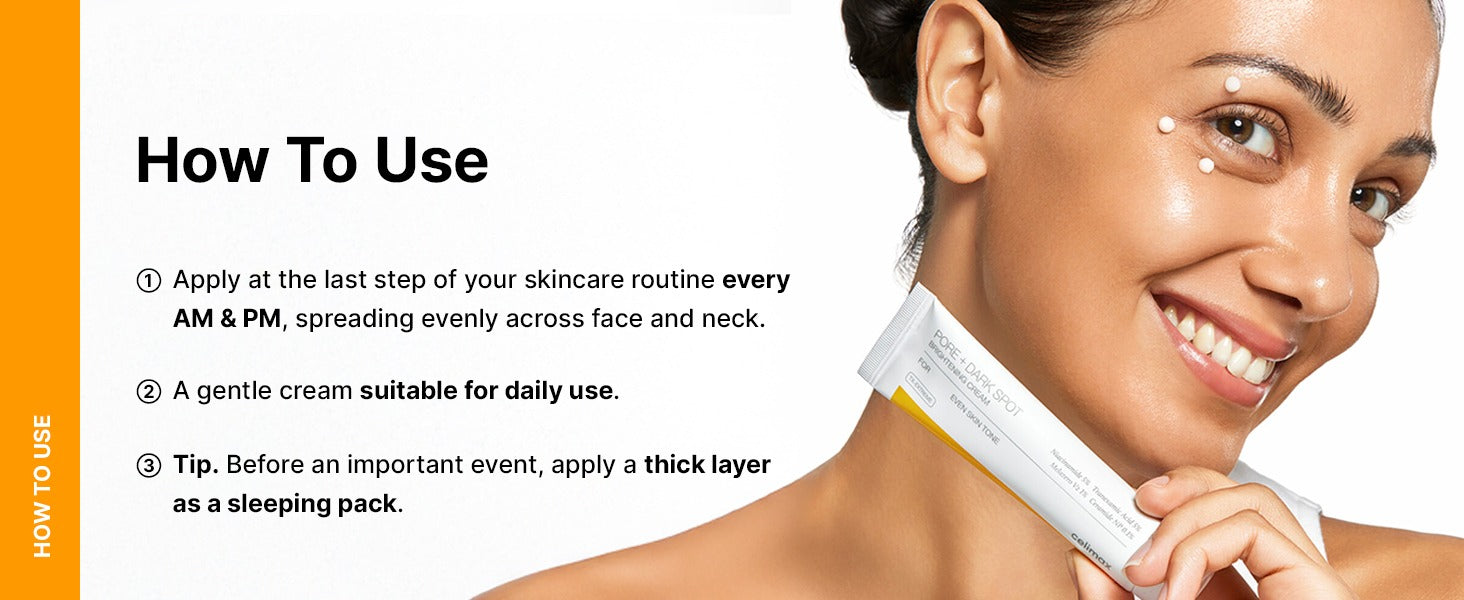 Celimax Pore+Dark Spot Brightening Cream brightens and evens out the skin tone with three types of blemish care. This low-irritant brightening cream is gentle enough for daily use, both morning and evening. Formulated with 5% Niacinamide, 5% Tranexamic Acid, and 1% Melazero V2, it provides comprehensive melanin care.