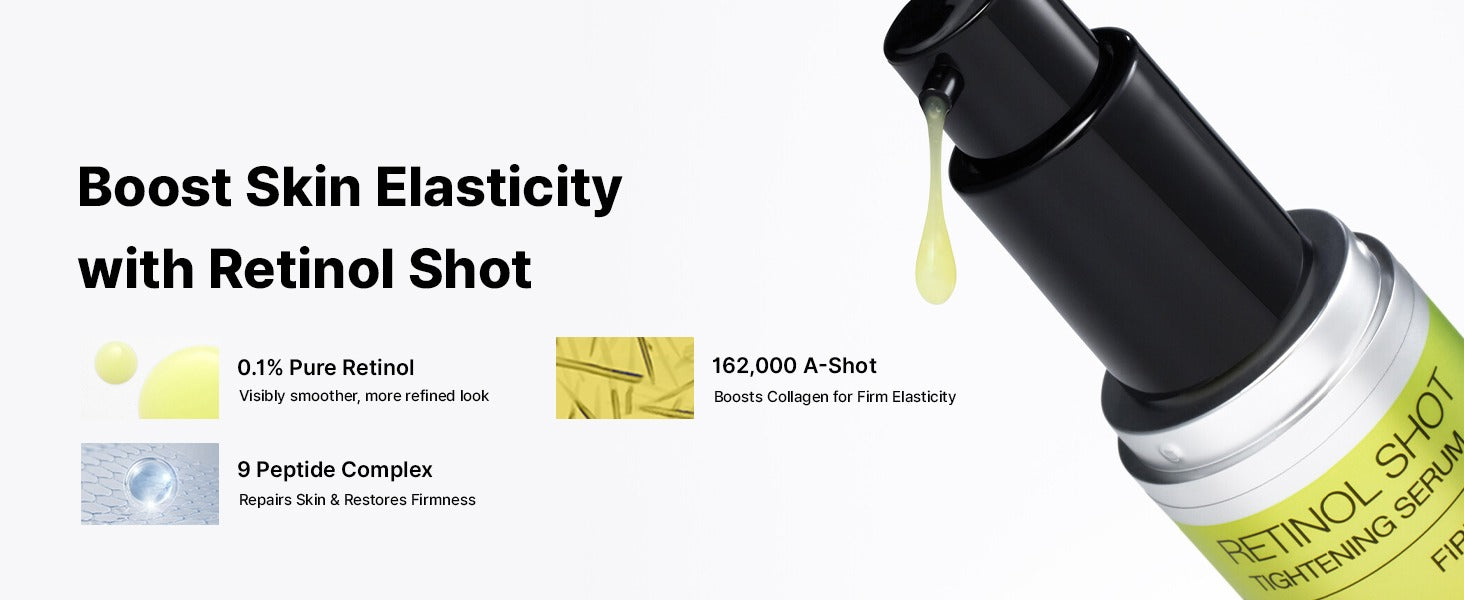 • Retinol Shot Tightening Serum – Contains 0.1% pure retinol, 9-peptide complex, 1% panthenol, and 162,000 A-Shot™